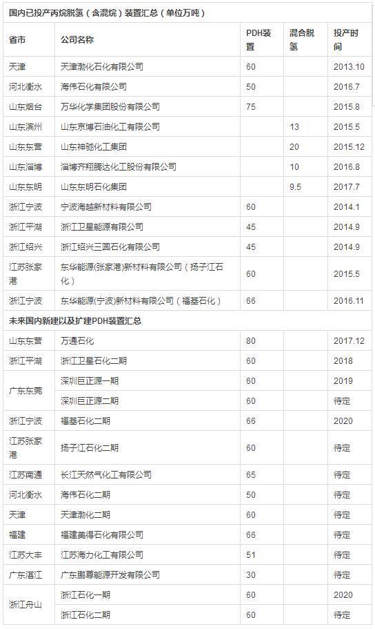 近年來,丙烷脫氫工藝在中國迅速發(fā)展,產(chǎn)能擴張速度驚人,逐漸成為丙烯重要來源之一。自2013年10月,隨著天津渤化60萬噸/年的丙烷脫氫裝置投產(chǎn)運行,丙烷脫氫裝置在國內(nèi)正式拉開序幕。此后的幾年里,丙烷脫氫裝置在國內(nèi)遍地開花,迅速發(fā)展,主要集中在華東的江浙地區(qū)、華北地區(qū)以及山東地區(qū),而且近兩三年混合烷烴脫氫這種更加靈活的裝置在山東地區(qū)陸續(xù)投產(chǎn)運行。至今,國內(nèi)丙烷脫氫(含混烷)制丙烯總產(chǎn)能達到513.5萬噸。但是從下表可以看出,華南地區(qū)尚無丙烷脫氫裝置,深圳巨正源丙烷脫氫裝置建成后,將填補華南地區(qū)丙烷脫氫制高性能聚丙烯及下游加工項目的空缺,給當(dāng)?shù)鼗て髽I(yè)提供優(yōu)質(zhì)的化工原料。