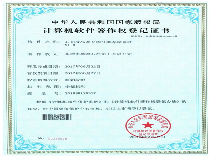 石化成品油分類存儲系統著作權登記證書