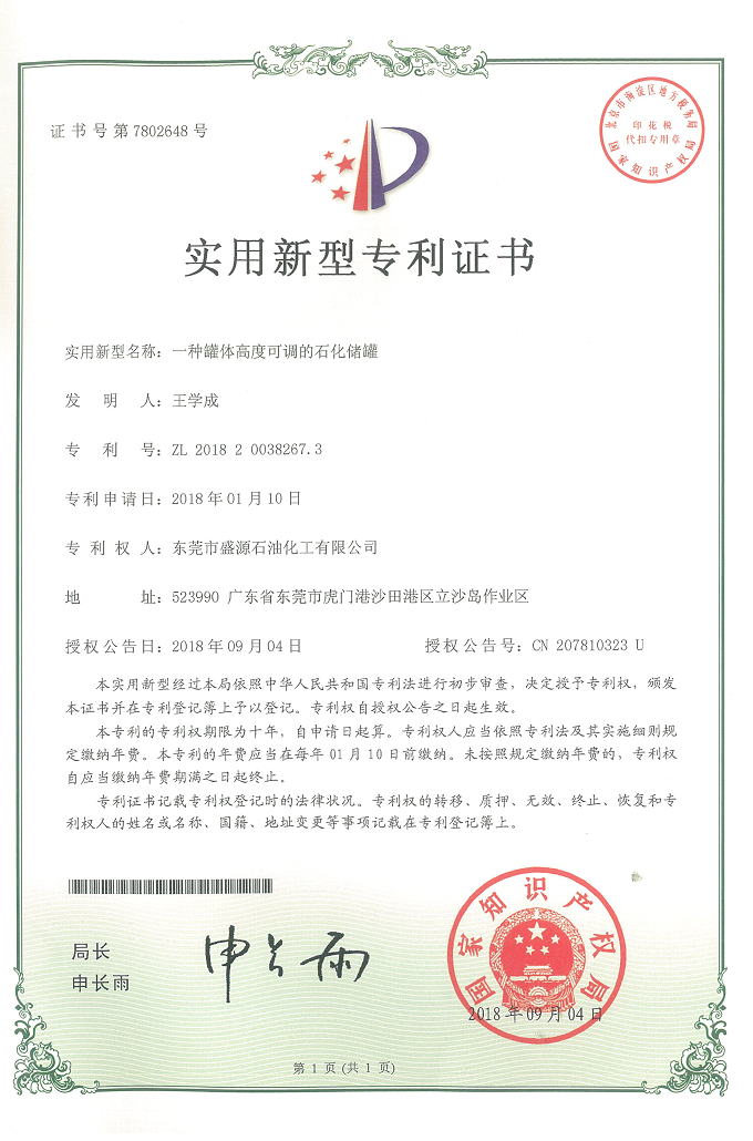 實(shí)用新型可調(diào)儲(chǔ)罐專利證書(shū)