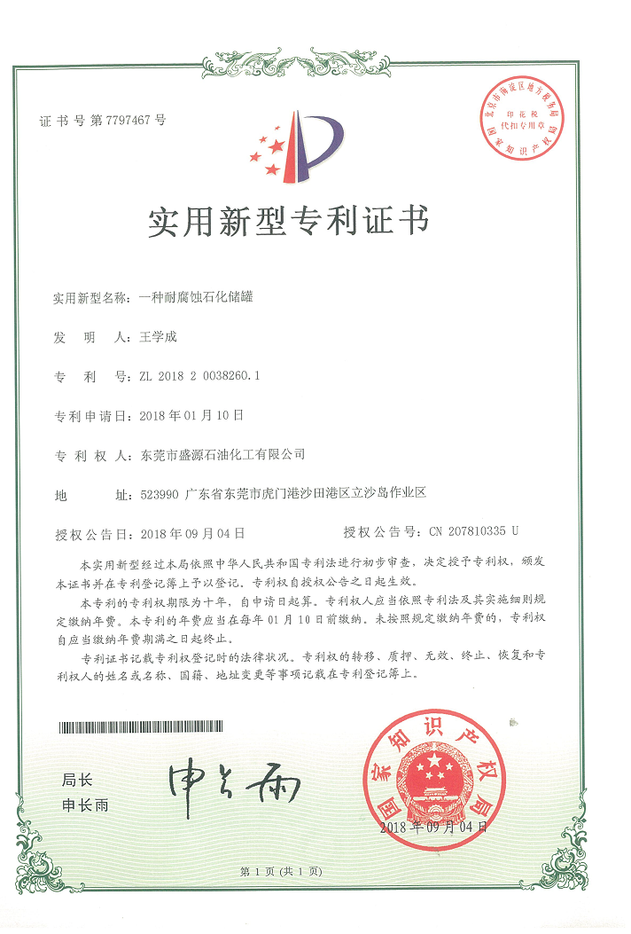 實(shí)用新型耐腐蝕儲(chǔ)罐專利證書(shū)